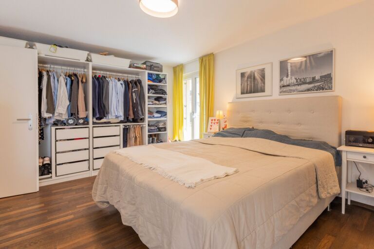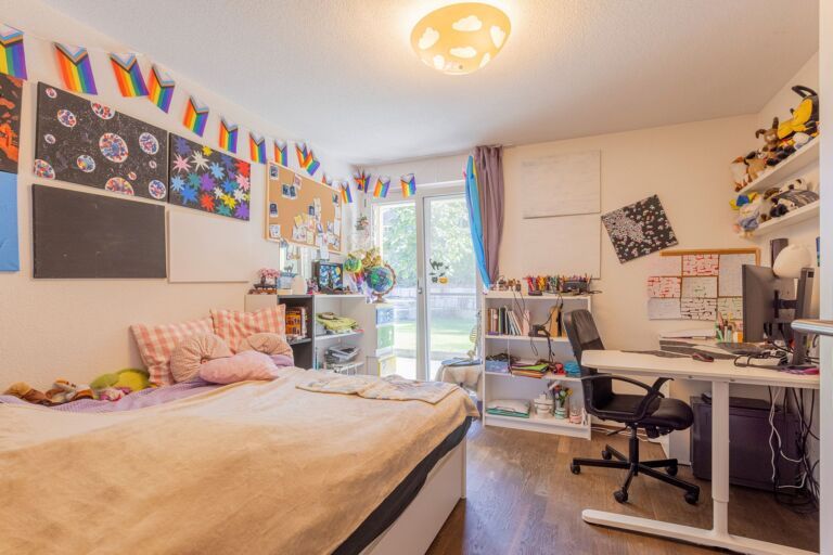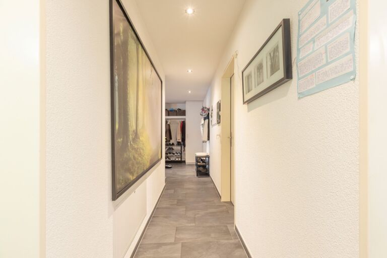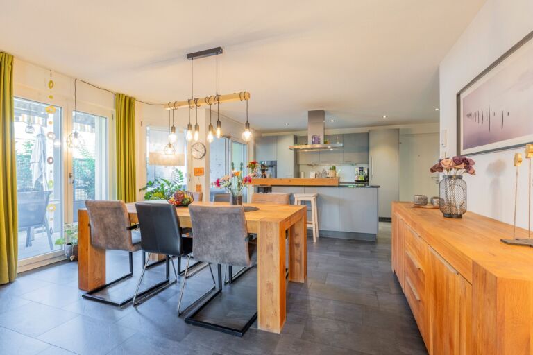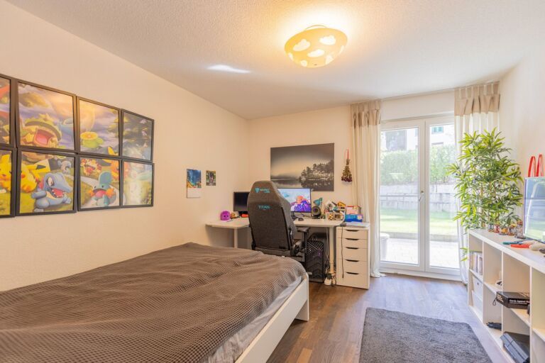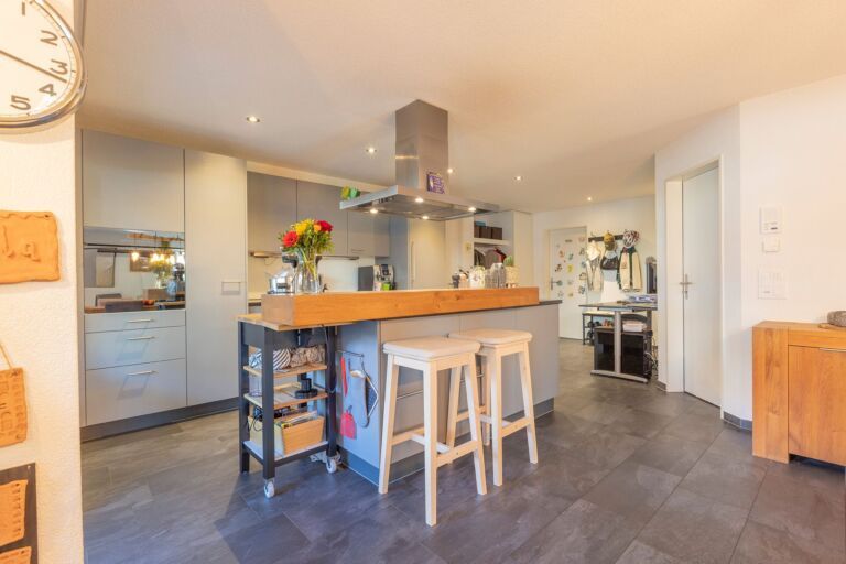 In der Wohnung angekommen, werden Sie von einem grosszügigen Entree mit einer praktischen Garderobe empfangen. Das Entree bietet ausreichend Platz für einen Schreibtisch oder eine Kommode, um Alltagsgegenstände bequem zu verstauen und den schnellen Aufbruch zu erleichtern. Direkt gegenüber befindet sich ein nützliches Reduit, das zusätzlichen Stauraum bietet. Die offene und moderne Küche, ausgestattet mit einer stilvollen Kochinsel, lädt dazu ein, kulinarische Köstlichkeiten für Familie und Freunde zuzubereiten und gemeinsam gesellige Stunden zu geniessen. Von der Küche aus eröffnet sich Ihnen der grosszügige Wohn- und Essbereich, der durch seine Offenheit und Helligkeit besticht. Von hier aus haben Sie direkten Zugang zu zwei Terrassen, eine auf der Nord- und eine auf der Westseite des Hauses. Zusätzlich gibt es auf der Südostseite der Liegenschaft eine weitere Terrasse. Der weitläufige Aussenbereich bietet Ihnen die Möglichkeit, zu jeder Tageszeit den idealen Platz zu wählen, sei es in der Sonne oder im kühlen Schatten. So können Sie Ihre Zeit im Freien ganz nach Ihren Vorlieben geniessen. Über den Korridor gelangen Sie vom Eingangsbereich zu den Zimmern der Wohnung. Die beiden kleineren Zimmer, jeweils mit einer Grösse von rund 12 m², eignen sich ideal als Kinderzimmer oder Büro. Das Hauptschlafzimmer ist mit seinen 19 m² grosszügig bemessen und bietet ausreichend Platz für eine komfortable Einrichtung.