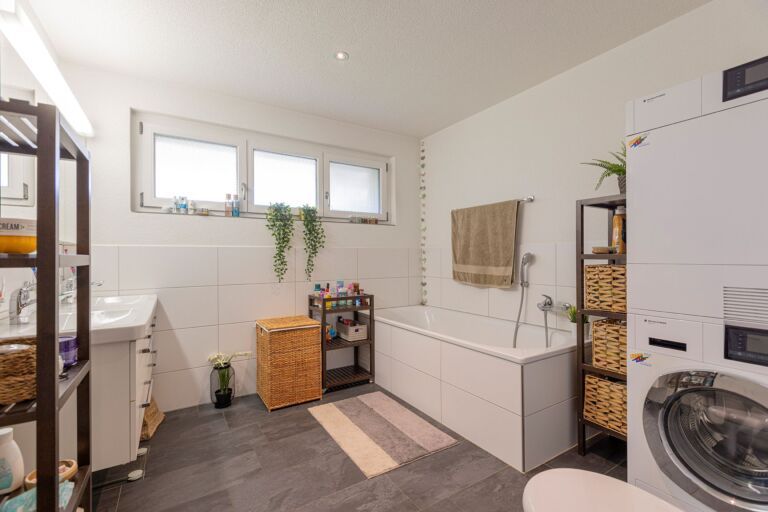 Die Wohnung verfügt über zwei Badezimmer: Das erste Badezimmer ist mit einer Dusche, einer Toilette und einem Waschbecken ausgestattet, während das zweite Badezimmer eine Badewanne, eine Toilette und ein Doppelwaschbecken bietet. Zudem befindet sich im grösseren Badezimmer ein praktischer Waschturm mit Waschmaschine und Trockner, der Ihnen das lästige Tragen der Wäsche in den Keller erspart. Die durchdachte Anordnung der Räume sorgt für maximalen Komfort und Funktionalität im Alltag.